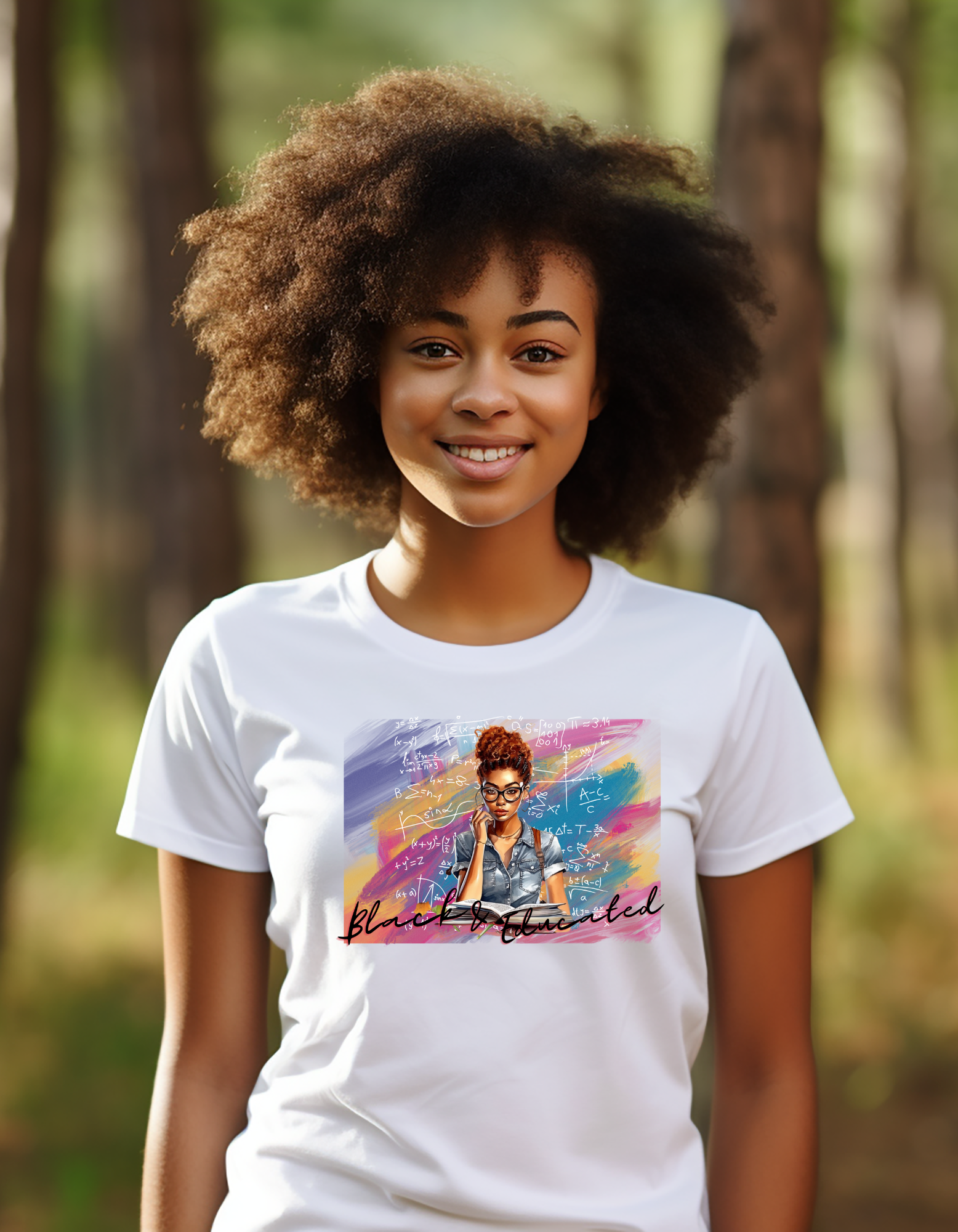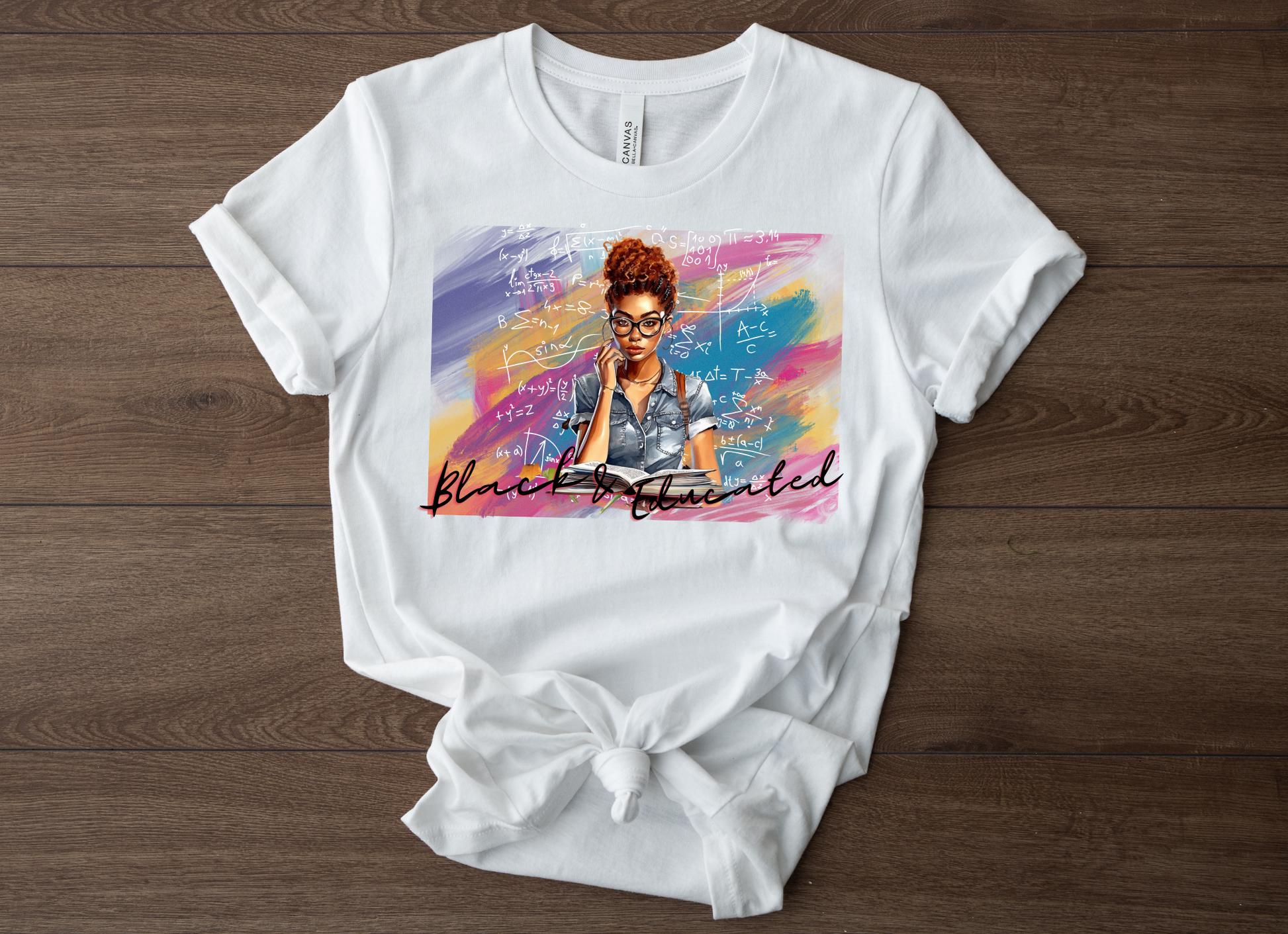 The background is a splash of colors, creating a dynamic and inspiring aura around the central figure, highlighting the harmony between knowledge and vibrance. With the bold caption "Black & Educated" featured prominently, this shirt is not just an item of clothing—it's a statement of achievement and identity.