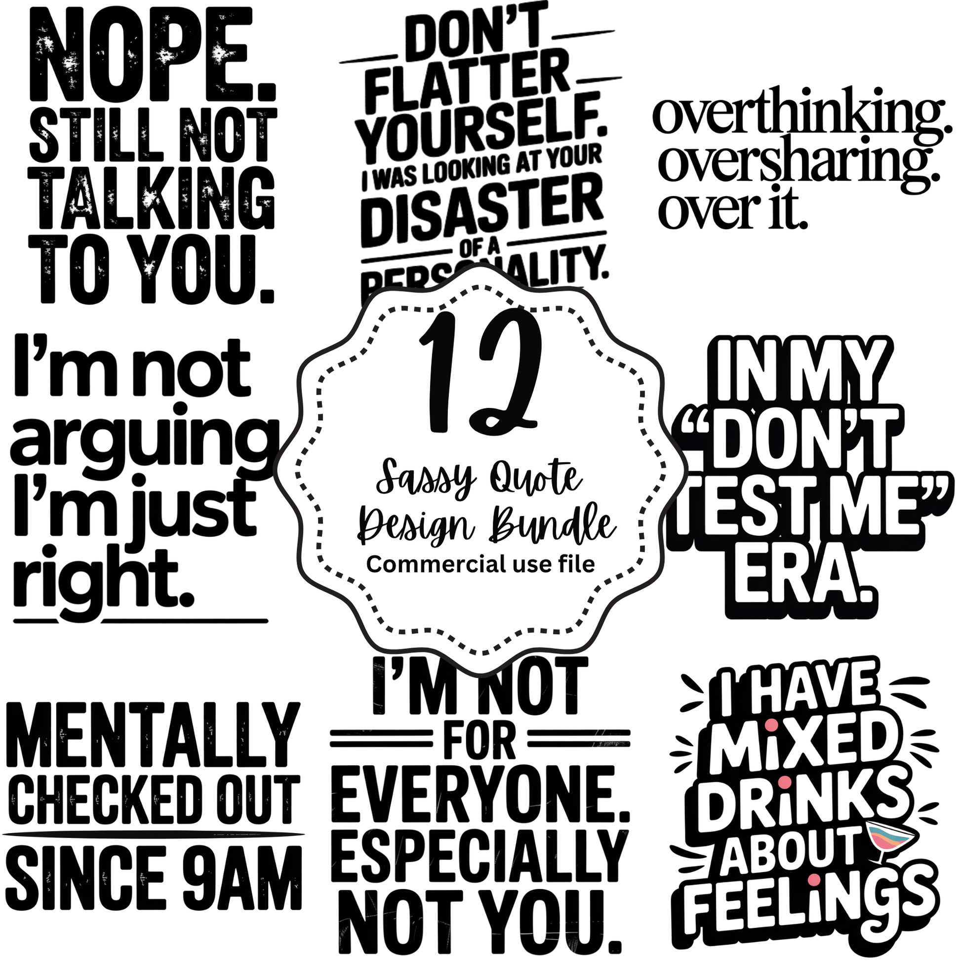 😈 For the bold, the blunt, and the unapologetically loud. This bundle of 12 high-impact sassy quotes is made for creators who love sarcasm, dry humor, and a little side-eye. Whether you're a T-shirt boss, sticker maker, or mug magician — these designs will slap and sell.