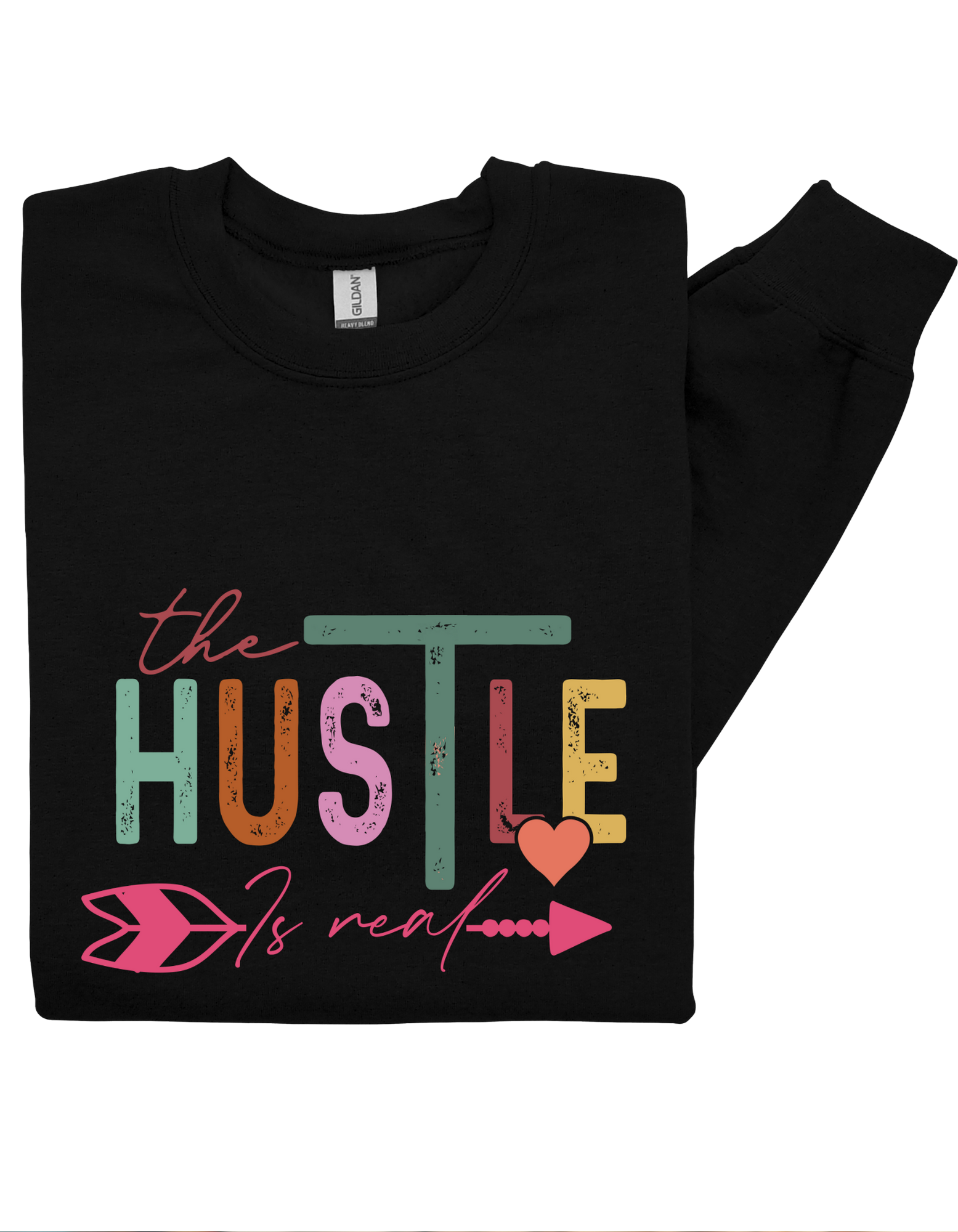 “The Hustle is Real” sweatshirt is more than a vibe — it’s a whole lifestyle. Designed with a playful yet powerful combo of earthy and vibrant block letters, script text, and a cute heart-arrow graphic, this sweatshirt captures the hustle mindset in every stitch.