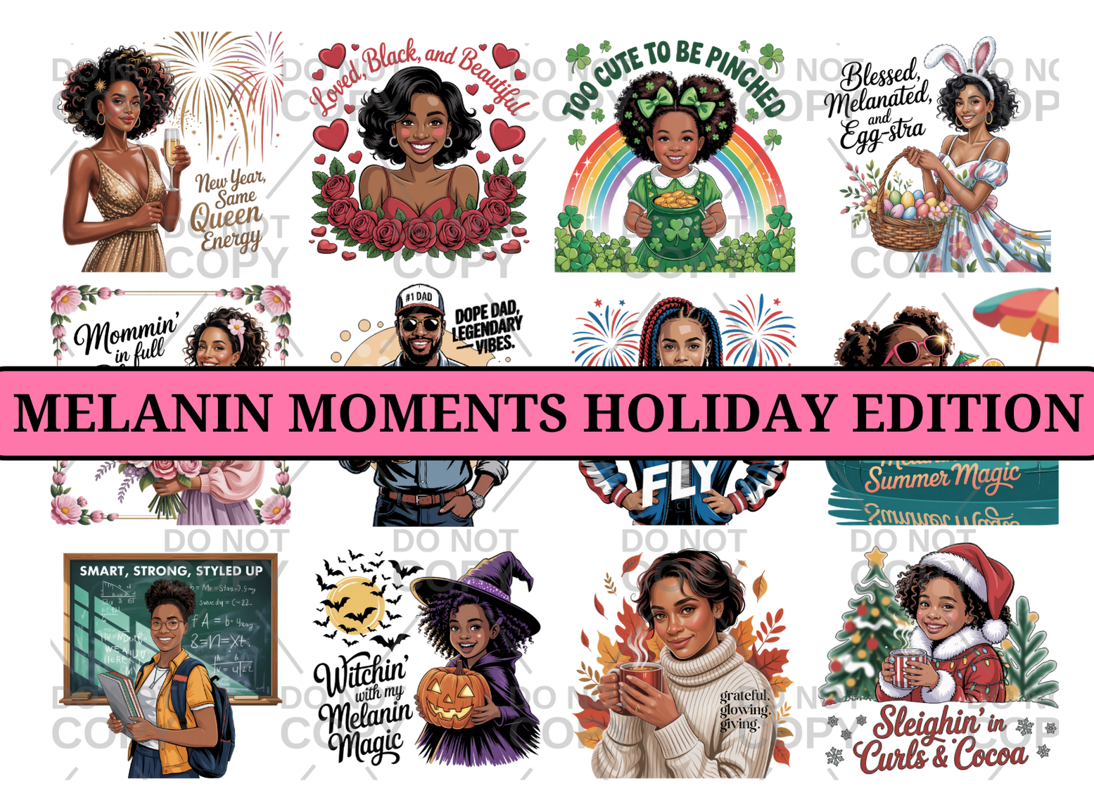 The Melanin Moments Holiday Edition is a stunning bundle of 12 high-quality digital PNG designs, each representing a major holiday or seasonal moment—from New Year's sparkle to sleighin' Christmas curls.